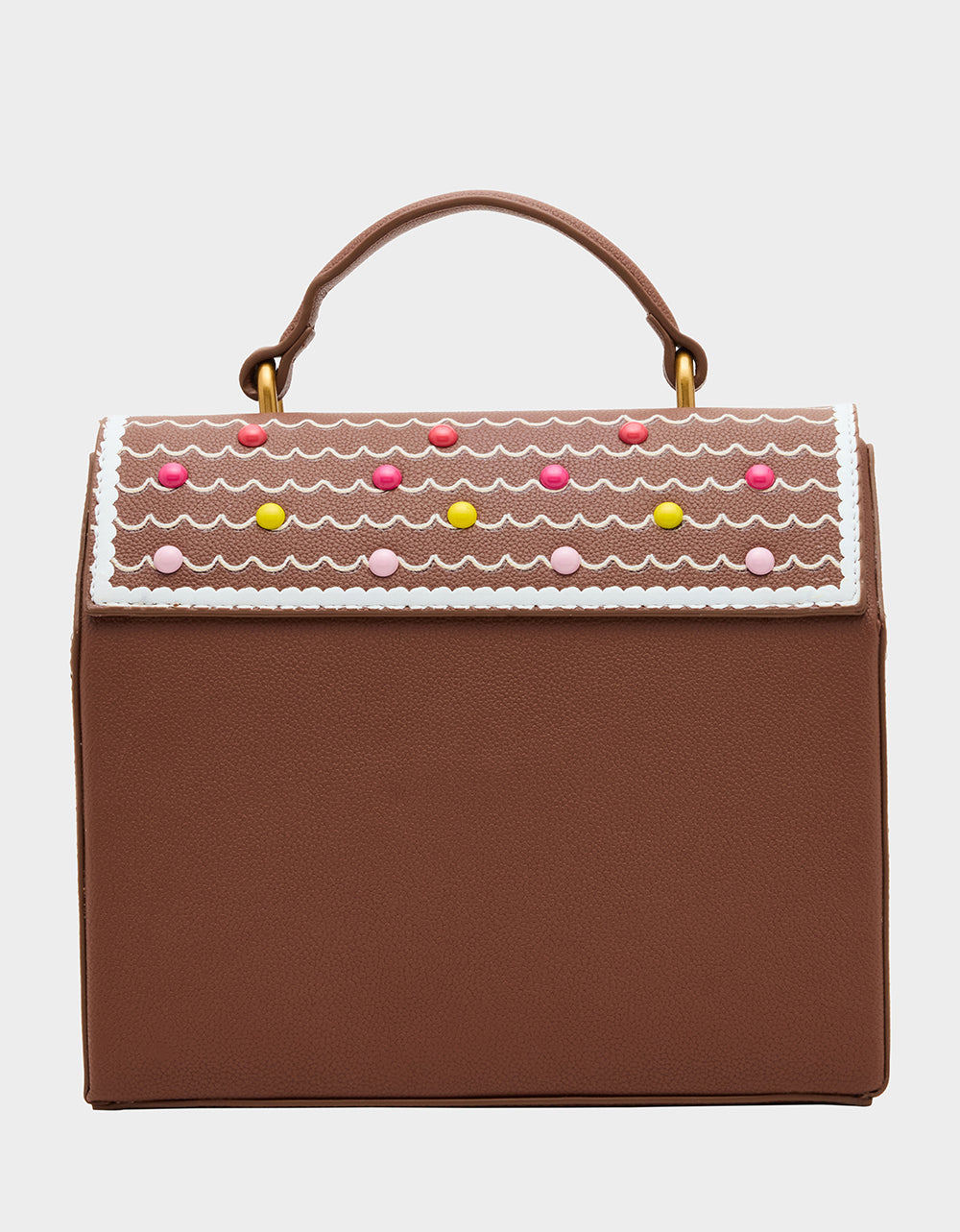 Celebrate the holidays with the charming BAKING SPIRITS BRIGHT BROWN crossbody ! Shaped like a gingerbread house. it features a delightful print of gingerbread men. candy cane trees. peppermint candy train. presents. and snow. all topped with playful gumdrop details on the roof. This festive piece adds a whimsical touch to your seasonal look. making every moment feel sweet and merry.