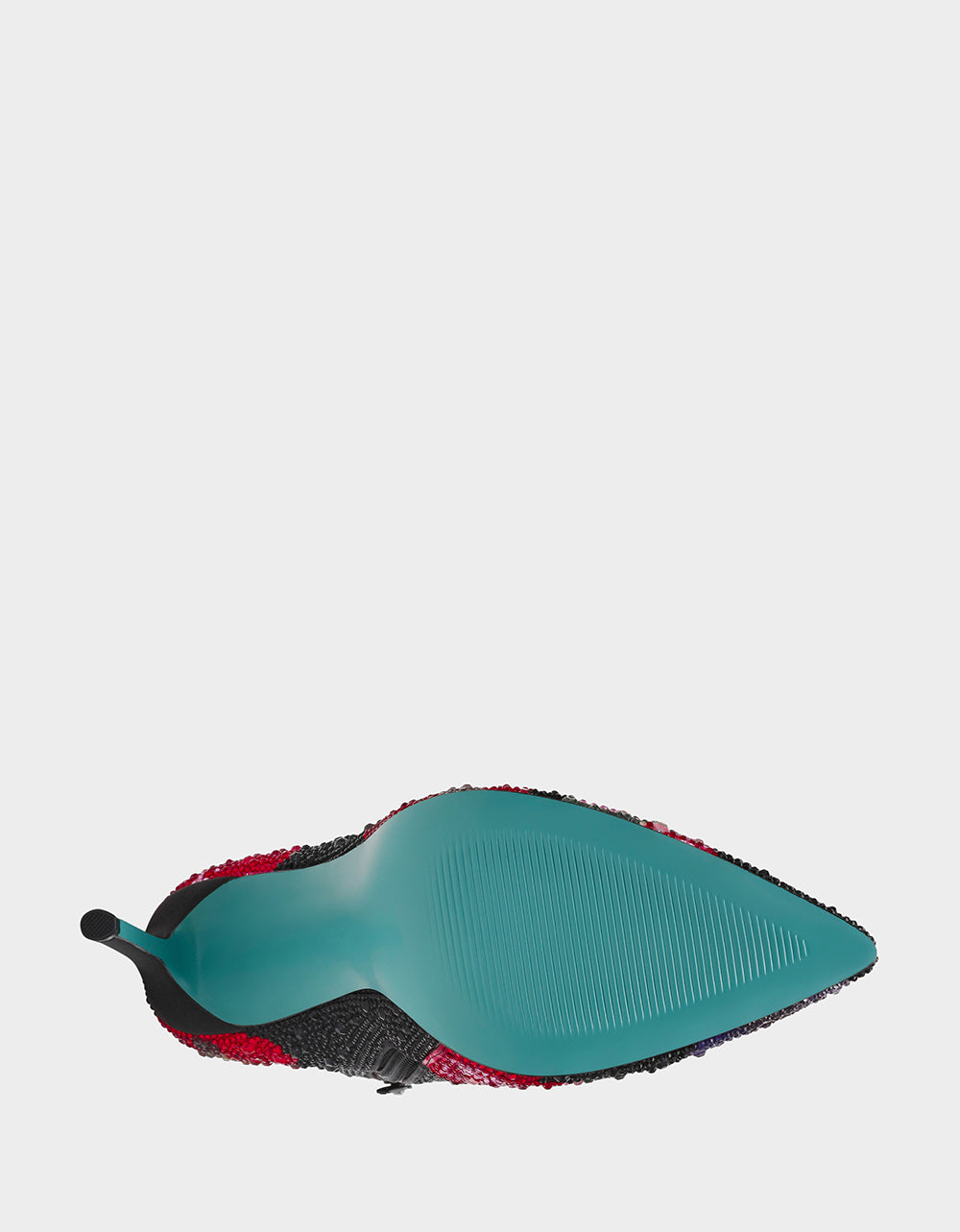 Step out in dazzling style with the BELLE BLACK FLOWER MULTI . Covered in sparkling rhinestones and bursting with a vibrant floral print. these Betsey Blue beauties feature a playful pointed toe and a signature classic blue sole. Perfect for turning heads and adding a pop of fun to any outfit!