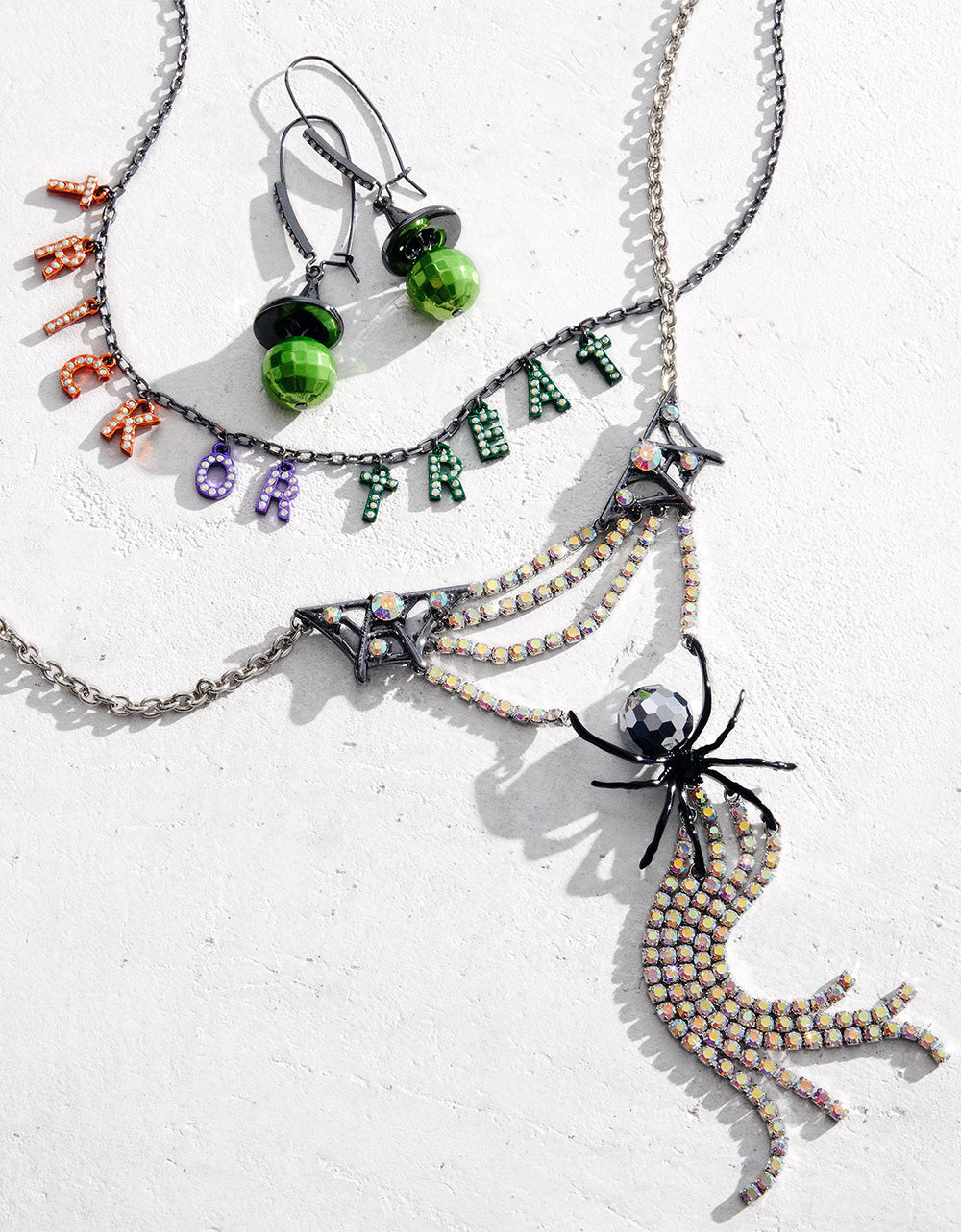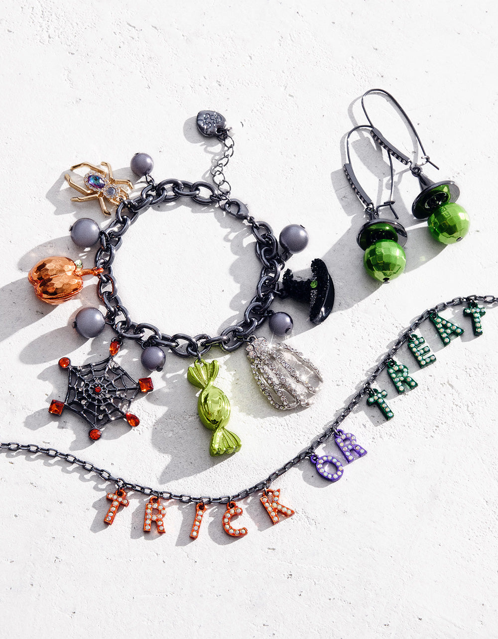 Playful dangle featuring elegant long ear wire with minimal stones. a witch hat. and vibrant green disco ball. Earrings have a shepherd’s hook closure. Made from metal and glass crystal.