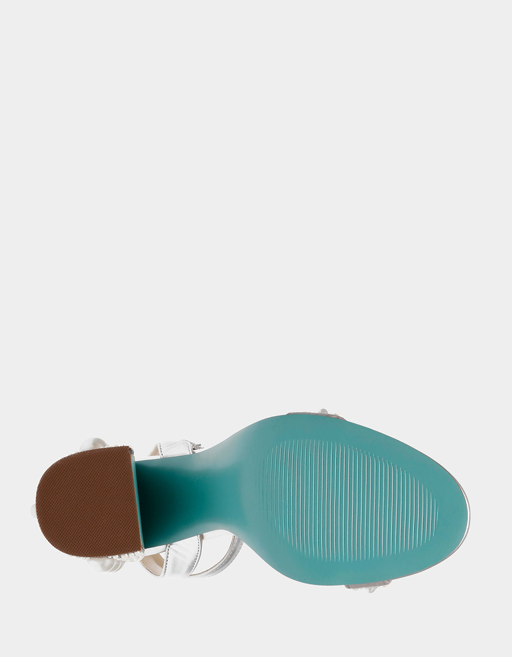 Elevate your outfit with the LEXI SILVER statement pearl . featuring an array of pearls on the flared block heel design! These heels are adorned with a variety of pearl sizes. making them stand out in style!