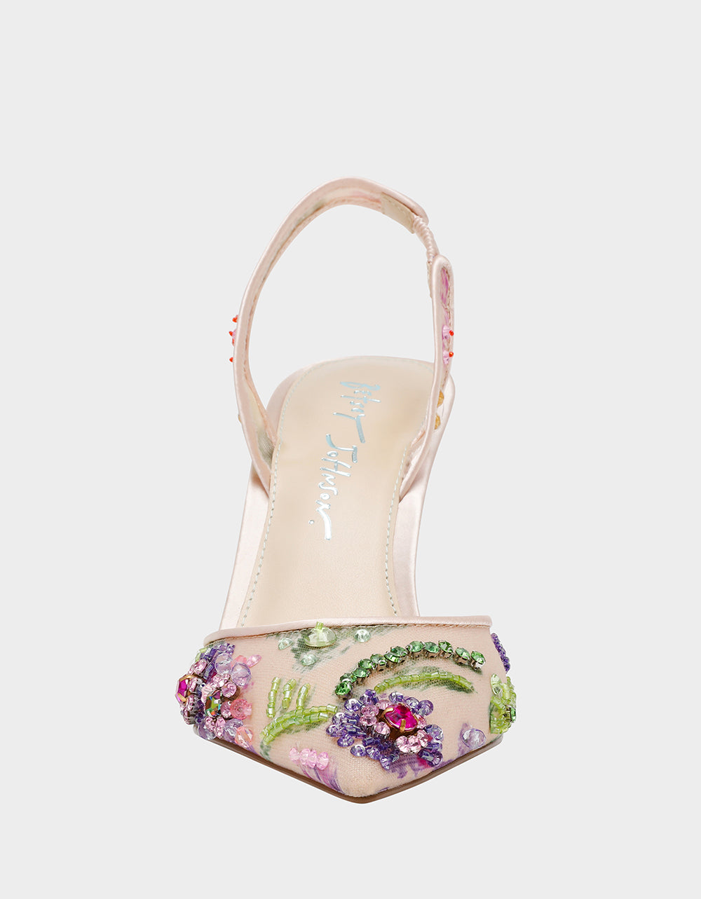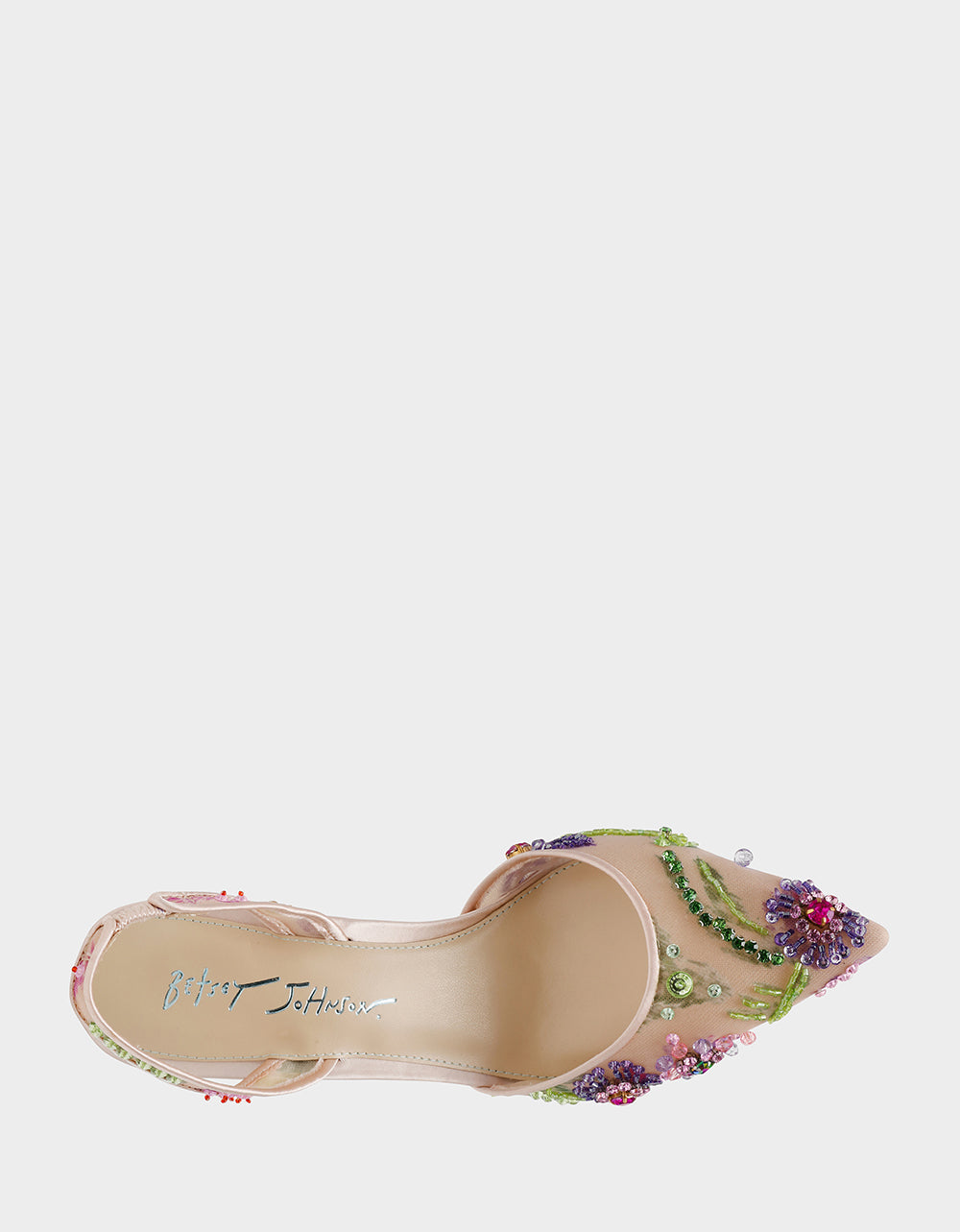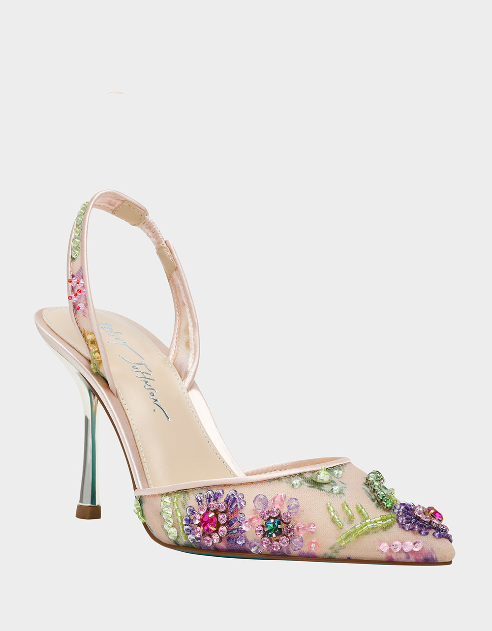 Sophisticated and chic. Betsey Johnson’s new VELMA is encrusted with jewels and beading! A rich design is made wearable with a delicate sling back strap and padded footbed.